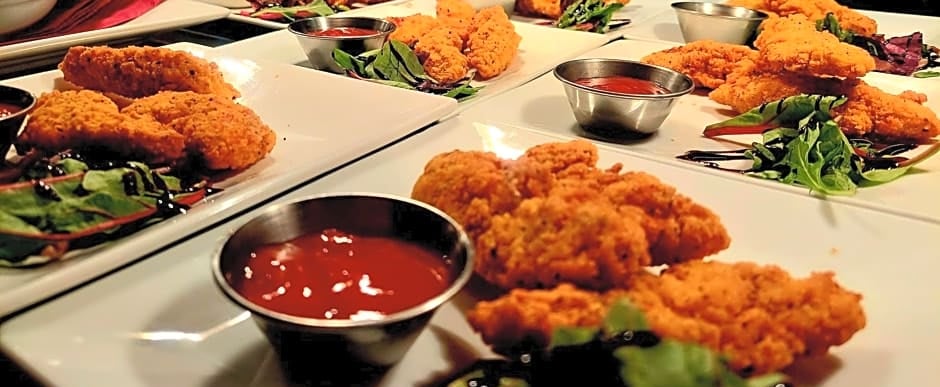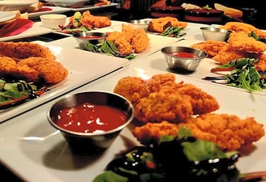 Crispy golden chicken bites served with fresh salad garnish and sweet & sour dipping sauce